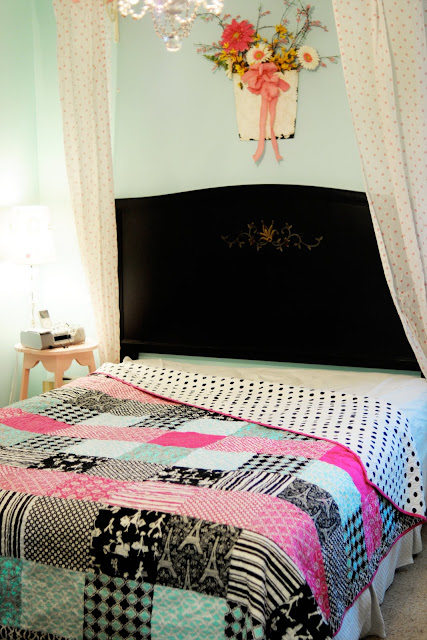 I adore how this quilt turned out. It gives the room so much more pizzaz! I really wanted to bring out the black in her bed and her dresser.