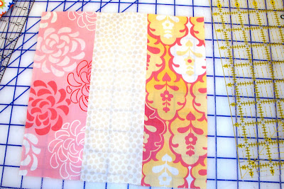 With the cream in the center, begin sewing the 3 colored strips together, taking care to vary the patterns not to have 2 blocks the same.