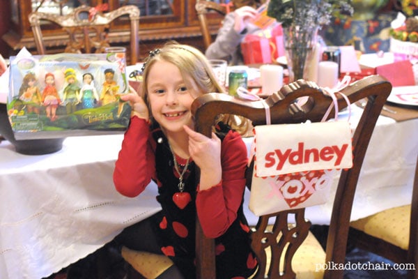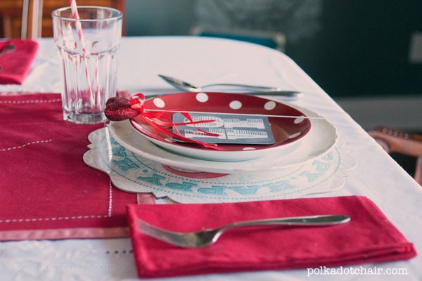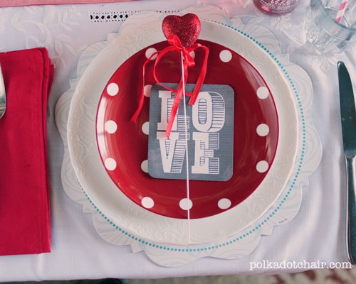 Just a simple place setting. Fun cardboard chargers I found at the craft store, white china, red polka dot plates and a little LOVE note for each person.