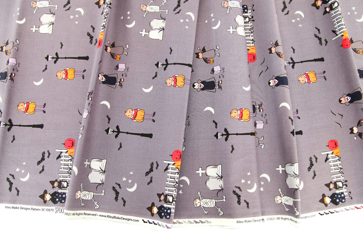 The quilt pattern is designed to be created with my Spooky Hollow fabric collection from Riley Blake Designs. The collection was released in April of this year and features a saturated palette of greens, purples, oranges, and grays.