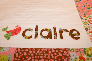 Trace the mirror image of the letters onto the paper side of a piece of Heat n Bond Lite. Cut out roughly and iron onto the wrong side of the fabric. Cut out. You can see photos of my applique method here.