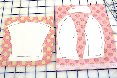 Trace the Jockey silks pattern onto Heat N Bond lite. Cut the arms and collar off the main body of the shirt. Iron the shirt to one polka dot print and the sleeves & collar to a 2nd print.