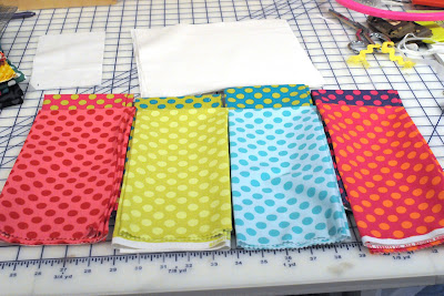 I wanted a table topper to put out with my Derby decorations (photos coming this week). I love the bright colors of the Jockey silks at the Derby, so I decided to use them as my inspiration for the table topper. (All of the polka dot fabric is Michael Miller)